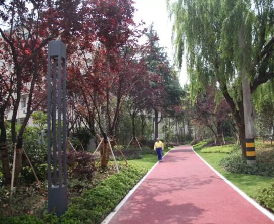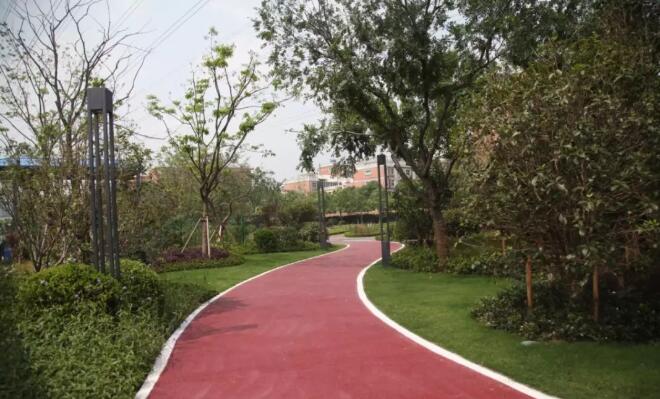 慢步道采用彩色透水混凝土,部分活動場地采用生態(tài)陶瓷透水磚,體現(xiàn)“海綿城市”的生態(tài)透水理念。