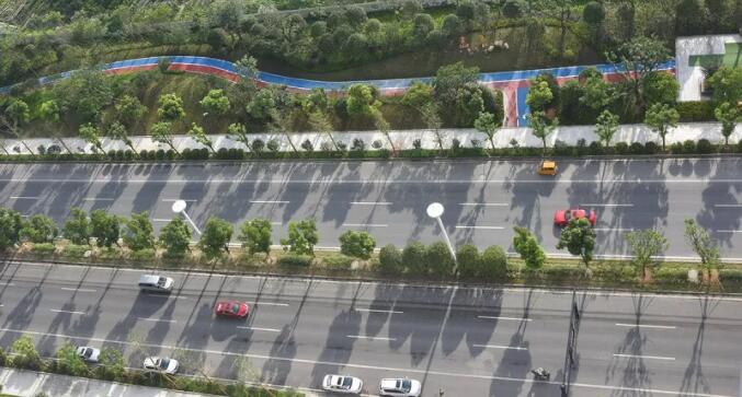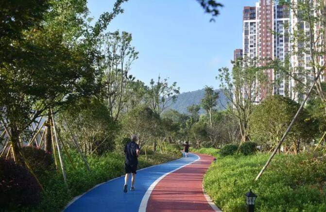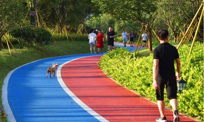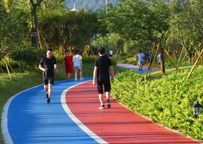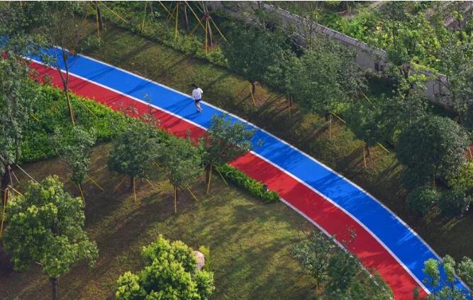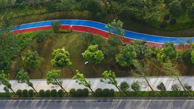 據(jù)了解,這條剛剛于今年5月竣工、紅藍相間的健身步道,是平陽縣首條雙色綠道。寬3.5米的彩色透水混凝土路面,呈帶狀鑲嵌在寬度25米的綠化帶中間,從空中俯瞰,似一條彩帶蜿蜒,十分顯目。