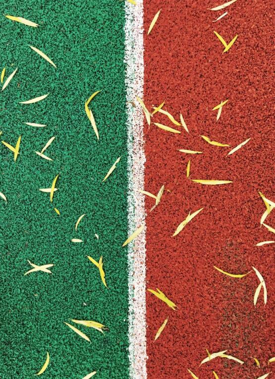跑道是彩色的,紅色間著綠色,三條是紅色的,兩條是綠色的,像是彩色的五線(xiàn)譜攤鋪在綠色的畫(huà)板上一般。