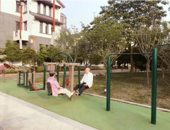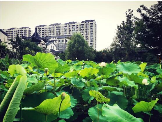 最南邊是一個(gè)小型的兒童露天樂(lè)園,幾個(gè)紅色、黃色、藍(lán)色的滑梯、迷宮、秋千,圍成一個(gè)小天地;兒童樂(lè)園的北面是一個(gè)泳池連著的飛檐峭壁的中式建筑,在建筑物的北面有一個(gè)小橋、流水、石板路散布其中的荷花池,荷花池的西側(cè)是用太湖石堆砌出的一座假山;再向北又是一個(gè)小水池和小廣場(chǎng),小廣場(chǎng)上放置著一些單杠、雙杠及老年人用的健身器材。