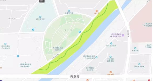 先放個地圖,大家可以看下位置,跑道的位置就在七里河北路,北從農(nóng)業(yè)南路開始,南到商鼎路。旁邊還有一個七里河公園,同時毗鄰鄭州市圖書館,區(qū)位位置可謂高大上。