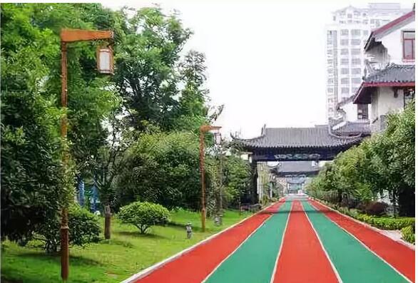 這是坐落在幾個小區(qū)中間的健身場所。入口處有用石材鋪裝的小廣場,接著就是跑道。