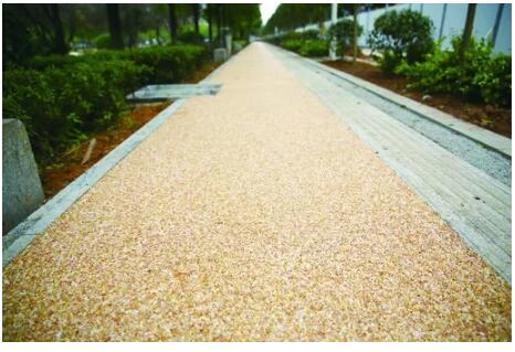 聚氨酯碎石混合料是一種新型路面材料,不僅生態(tài)環(huán)保,還能將天然色的碎石粘結(jié)成極其堅(jiān)固穩(wěn)定的開(kāi)放性孔隙結(jié)構(gòu),具有開(kāi)孔的表面及相互連接的內(nèi)部孔洞,其吸水性極強(qiáng),下雨天不會(huì)一踩一腳水。