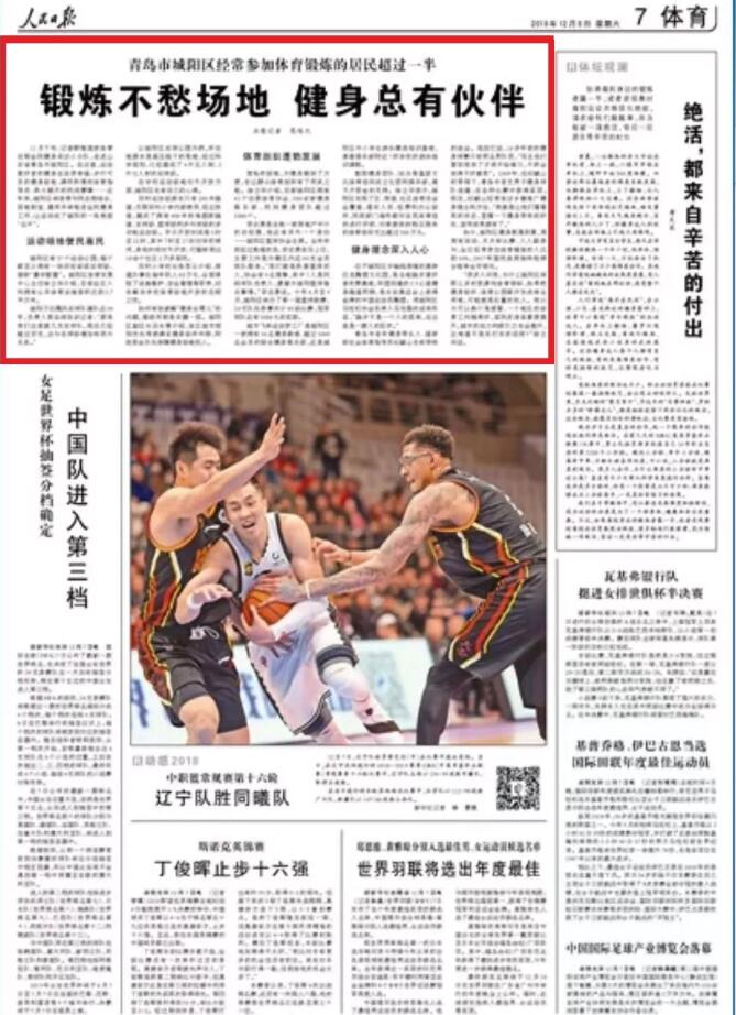 2018年12月8日,《人民日?qǐng)?bào)》第七版頭條,以“鍛煉不愁場(chǎng)地 健身總有伙伴:青島市城陽區(qū)經(jīng)常參加體育鍛煉的居民超過一半”為題,報(bào)道了城陽區(qū)“全民健身”工作的開展。