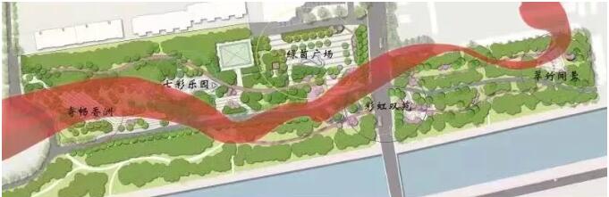 彩虹雙苑:彩虹橋下的休閑半私密小廣場。為居民和游客提供休息,聊天、下棋的活動空間。運(yùn)用場地與綠化分割形式,注重人與人之間、人與自然之間的對話交流。