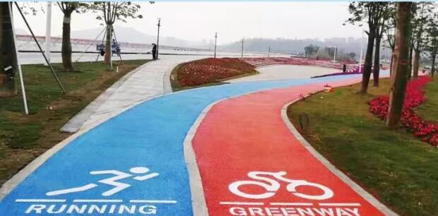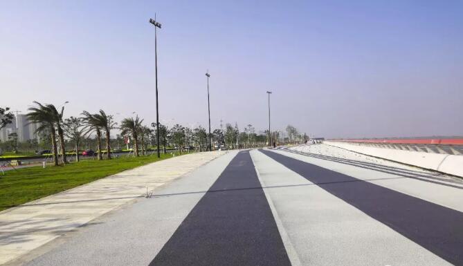 項目利用紅藍兩條濱水自行車道和綠道作為串聯(lián),將整個項目各分散部分完整地連接起來。整條透水海綿路面,利用經特殊工藝處理的納米材料對膠凝材料進行改性,改善了無機聚合物材料的物相組成和微觀結構,使之具有高吸水率、高透水率、高強度、抗?jié)B、抗凍、抗沖、耐磨、耐化學腐蝕等顯著優(yōu)點,能對雨水進行初步凈化。同時,路面保護層采用水性環(huán)保耐磨材料,同時添加納米光觸媒材料,在提高耐磨性的同時,可有效降解汽車尾氣,改善空氣質量。
