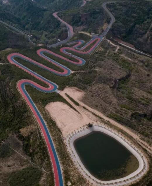 5月7日,山西省太原市,無人機航拍西山旅游公路一段彩色路面。這段公路鋪設(shè)了紅藍兩色瀝青,為當(dāng)?shù)嘏e辦國際公路自行車賽專用賽道。從高空俯瞰,這段公路彎彎曲曲,色彩鮮艷,橫亙在高海拔山頂,被當(dāng)?shù)孛癖姺Q為“云端上的彩虹公路”。