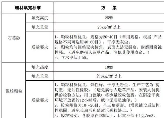1、石英砂除表格中要求外,要求用石英砂而非河沙,粒徑適中,顆粒均勻,無灰塵和泥土,主要目的是保持松軟防止板結(jié)而影響場地彈性。