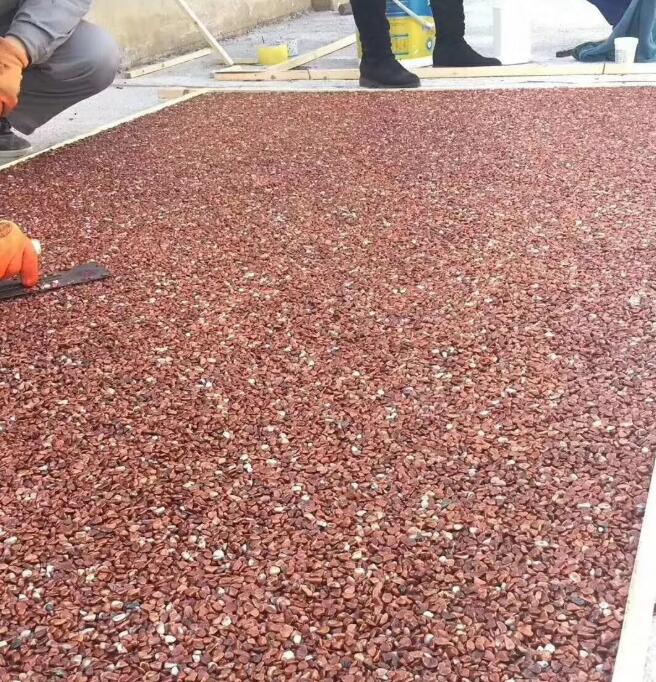 透水膠粘石以改性樹脂膠為粘接劑,各種天然石子、彩砂、彩色石子等)為骨料,加入多種高分子添加劑經混拌制成。 彩色透水地坪擁有系列色彩配方,配合設計的的創(chuàng)意,中間的孔隙無水泥、砂等細骨料填充,因此為了增加鋪裝強度,必須添加各種性能的專用強化劑。針對不同環(huán)境和個性要求進行鋪設施工。施工人員按照路面地塊、樹池等不同地塊需求進行現(xiàn)場鋪設、安裝,待整個路面鋪設完畢后覆蓋塑料膜加以保護,并噴上一層保護劑,確保材料徹底變干后顏色能長期保有,同時也可延長路面使用壽命。