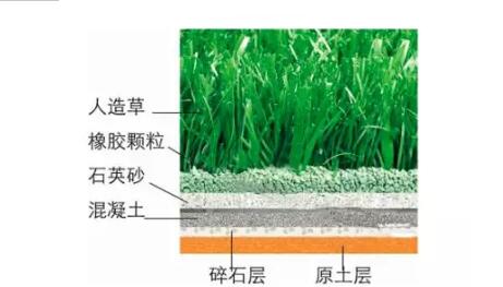人造草坪結(jié)構(gòu)圖如下,它和天然草坪區(qū)別不大,緩沖作用良好,可有效防止側(cè)滑、球的彈地和滾動正常。并不會像天然草坪那樣柔滑,在雨天很好的保護運動員在比賽過程中發(fā)生的側(cè)滑情況,也不會因為草坪而影響球速和運動軌跡。
