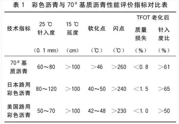 由于彩色透水瀝青的物理化學(xué)性能和普通瀝青相似,其在路面中應(yīng)用的過(guò)程也和普通瀝青相同,因此在最初的研究中,普遍沿用瀝青的評(píng)價(jià)指標(biāo)來(lái)判定彩色透水瀝青的性能。美國(guó)和日本普遍采用瀝青的針入度、延度、軟化點(diǎn)三大基本性能指標(biāo)來(lái)評(píng)價(jià)彩色透水瀝青的技術(shù)性能,同時(shí)為了保證使用時(shí)的安全,對(duì)彩色透水瀝青的閃點(diǎn)也作了最低要求。而為了保證彩色透水瀝青的耐久性,對(duì)于其老化后的質(zhì)量損失和針入度比也作了要求。整體來(lái)看,整個(gè)評(píng)價(jià)體系是參照普通路用瀝青,而各性能評(píng)價(jià)指標(biāo)要求又有別于普通瀝青。表1統(tǒng)計(jì)了美國(guó)和日本對(duì)彩色透水瀝青的性能要求。