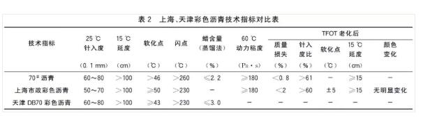 彩色透水瀝青技術(shù)在我國(guó)應(yīng)用之初,由于造價(jià)高,技術(shù)不成熟,因此并沒(méi)有形成系統(tǒng)的規(guī)范化要求。各地區(qū)根據(jù)當(dāng)?shù)夭噬杆疄r青的應(yīng)用范圍和使用要求,結(jié)合地理環(huán)境因素,制定了相應(yīng)的地方標(biāo)準(zhǔn)。在這些地方標(biāo)準(zhǔn)的制定中,彩色透水瀝青的評(píng)價(jià)指標(biāo)參照國(guó)外經(jīng)驗(yàn),基本上都以普通路用瀝青性能指標(biāo)為基礎(chǔ),結(jié)合實(shí)際工程經(jīng)驗(yàn),確定指標(biāo)范圍。以上海和天津兩地對(duì)彩色透水瀝青的評(píng)價(jià)指標(biāo)為例,對(duì)比70#基質(zhì)瀝青,如表2所示。