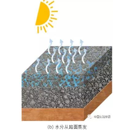 可以通過(guò)改變路面材料的熱物理性質(zhì)和路面與環(huán)境的熱交換方式,從而得到具有降溫功能的路面。具體的實(shí)現(xiàn)途徑為,以多孔路面材料為基體,在其孔隙中灌注吸水保水性材料,這種材料具有較好的吸水和保水能力(圖5)。在雨天或者灑水時(shí),能夠吸收水分,當(dāng)環(huán)境溫度較高時(shí),利用路面材料中持有的水分蒸發(fā)來(lái)降低路面溫度,減弱熱量在瀝青路面中的積累,改善瀝青路面的熱輻射效應(yīng),可以降低路表和路域的環(huán)境溫度,為道路周?chē)牡男腥撕托熊?chē)提供舒適的環(huán)境,從而起到緩解城市“熱島效應(yīng)”作用。其實(shí)現(xiàn)原理如圖6所示。