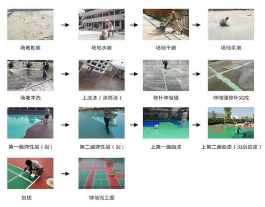 現(xiàn)場(chǎng)調(diào)料:丙烯酸乳液50KG,水泥兩包,80目石英砂3包,108膠水25公斤,加適量水,混合攪拌均勻,倒入施工現(xiàn)場(chǎng),用刮耙將漿液均勻刮涂再場(chǎng)地地面(基礎(chǔ))上,需掛涂2-3遍,待其干固4小時(shí),每一道施工完,干固后打磨平整,再用自來(lái)水試水平,積水處再配底涂混合料補(bǔ)平,直到符合積水率要求。