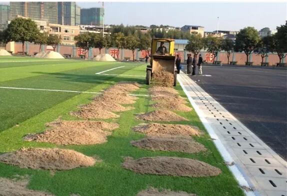 用鋪砂機及專用工具將石英砂沖入草坪,使其均勻平整,石英砂填充量為每平米25kg左右。