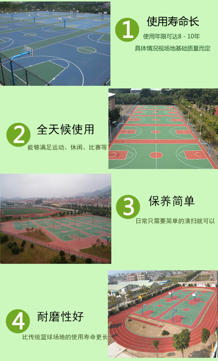 3、丙烯酸籃球場使用壽命長,使用年限可達8-10年(具體情況視場地基礎質量及施工質量而定);