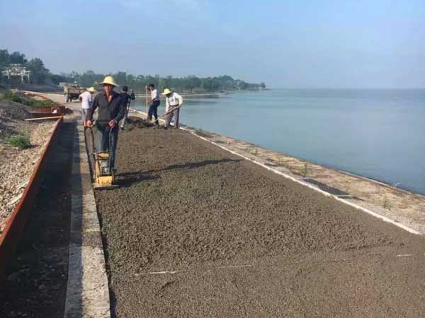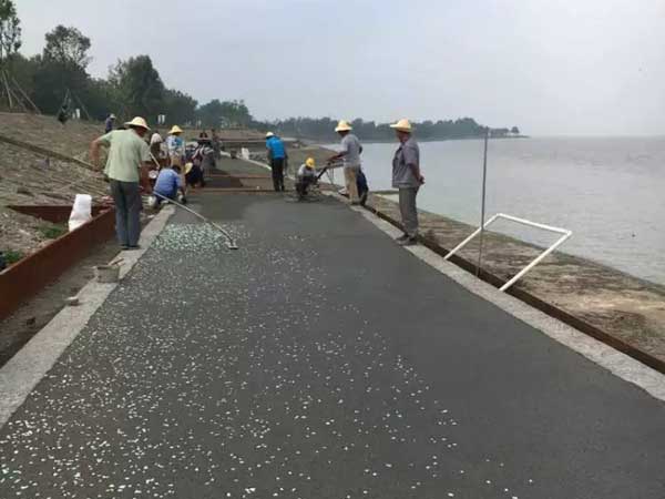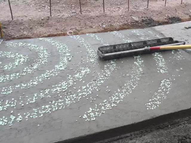 首先攤鋪普通的透水混凝土,將水泥、石子、膠結(jié)劑按照比例攪拌-攤鋪-整平抹光后,將人造夜光石通過(guò)人工嵌入混凝土的表面即可,擺放的形態(tài)隨意,最后噴涂罩光保護(hù)面油加強(qiáng)人造夜光石的粘接力和表面耐磨度。